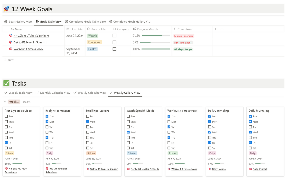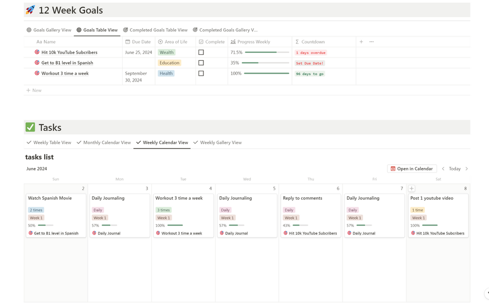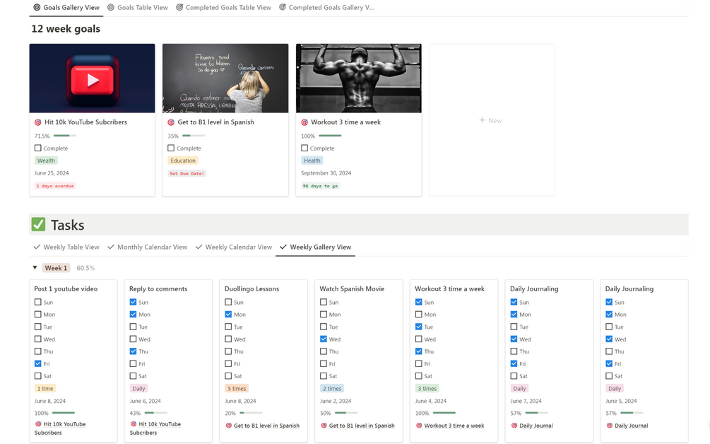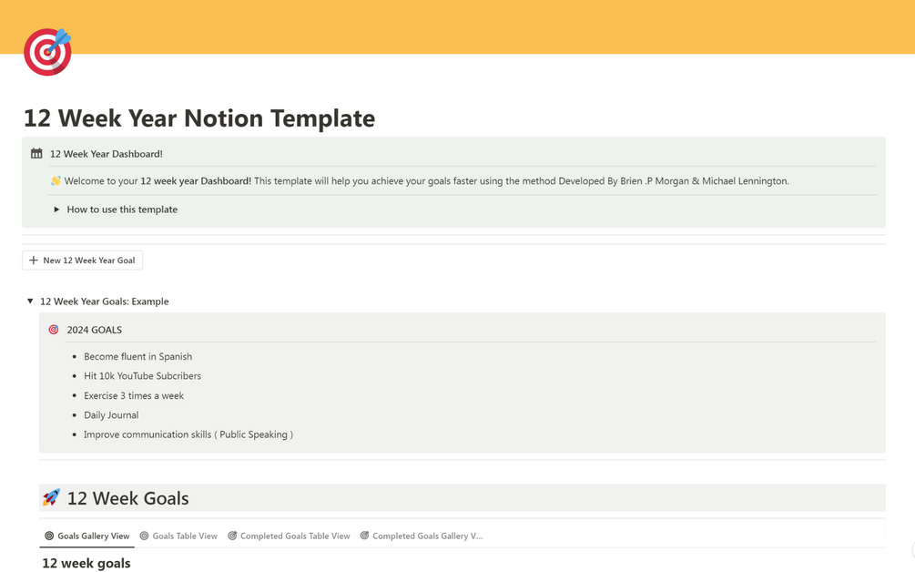 - This Notion goal tracker template comes with an advanced goal database where you can record your 12 week goals.