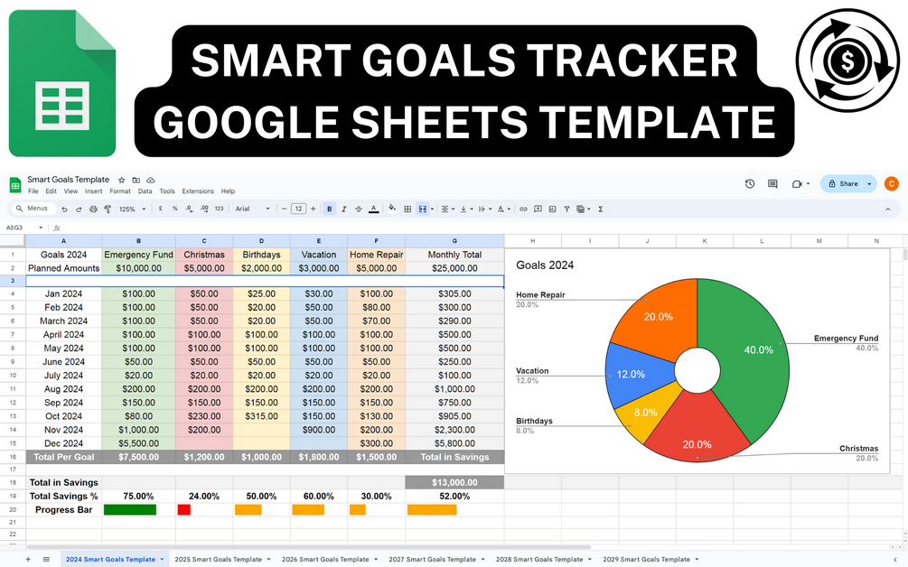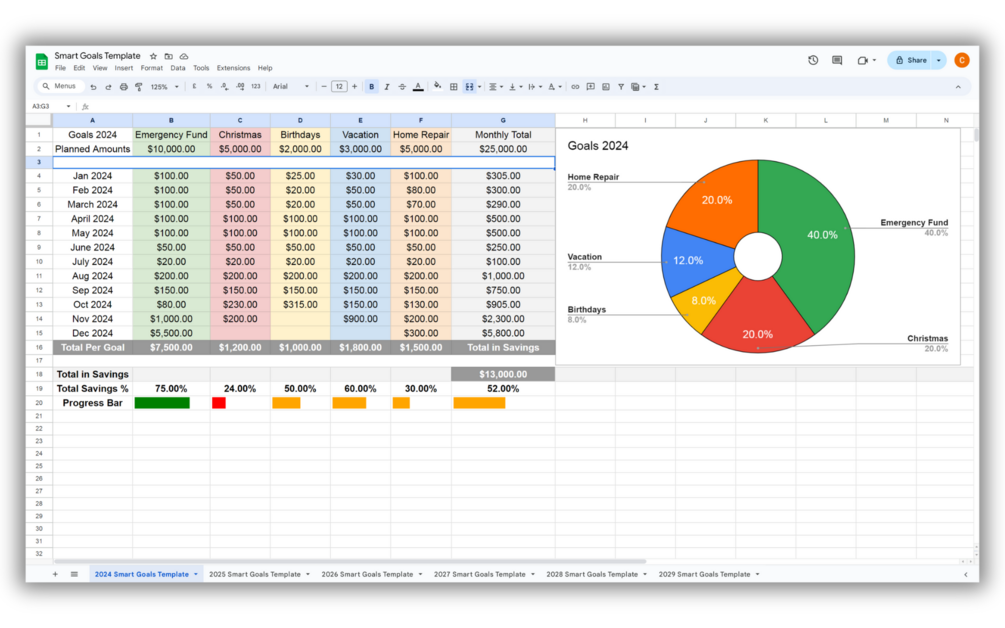 - Percentage Metrics: The template calculates the percentage progress for each goal, offering a numerical value to supplement the visual data provided by the pie chart and progress bars. This allows you to quantify your progress and understand how much more you need to contribute to reach each goal.
